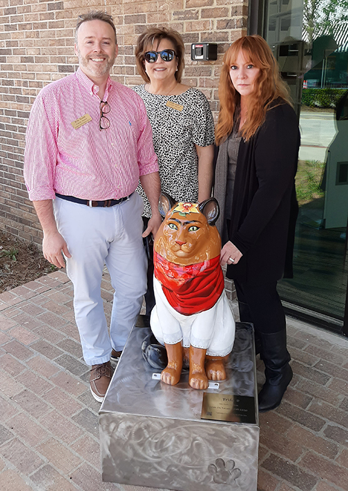 “Frida Kat-lo” is now installed in front of the Kershaw County Public Library (in Lancaster County, South Carolina). Left to right, Eric Grace and Debbie Jaillette of the LCCA, and Gina Noelle Ash at the dedication ceremony.